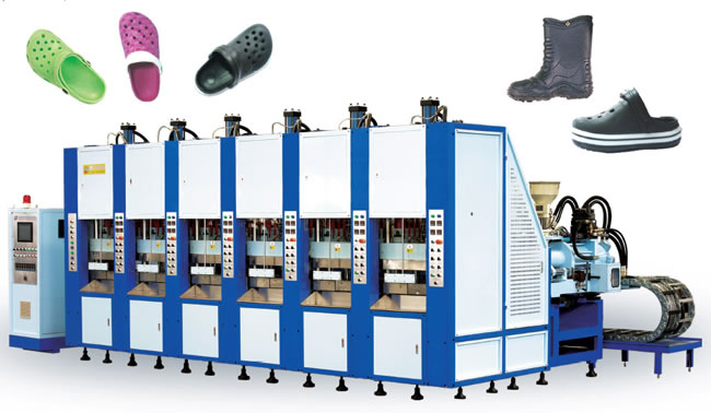 La máquina de moldeo por inyección de espuma EVA monocromo está equipada con dos inyectores de alta eficiencia completamente automatizados, combinado con un sistema de sujeción de moldes de alto desempeño de control de PC. Usando espuma de EVA (foamy) monocromo como materia prima, la máquina de moldeo por inyección puede producir suelas, medias suelas y varios tipos de productos fabricados en foamy.